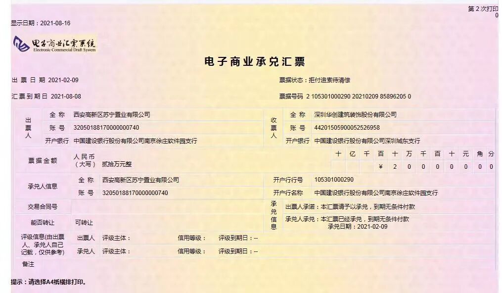 对于施工现场雇佣“群演”一事,记者致电了此前的西安苏宁置业负责人,无人接听。上述交通和住房建设局工作人员告诉记者,发生雇佣临时演员入场这件事后,我们又把苏宁置业叫来谈了一次。他们说雇佣演员一事不是他们做的,是底下施工装修单位处理的,究竟是谁?目前还没有办法核实。“苏宁置业给我们的理由是,由于交通和住房建设局督促复工时间比较紧,苏宁置业方面就将复工压力给到了负责装修的施工单位,施工单位由于没有兑现承诺中的500个工人就找来了‘演员’。”工作人员表示。记者从高新区交通和住房建设局处了解到,实际上,装修单位入场需要负责土建工程的单位提前把工作面腾出来,做一个交接。不过目前负责土建工程的中建一局并没有跟苏宁置业达成一致意见,原因就是苏宁置业拖欠其工程款。今年6月有消息称,中建一局和苏宁暂停了全国范围内合作。上述工作人员表示,“中建一局现在已经把跟苏宁的战略合作协议解除了,但是继续履行工程合同。资金问题是目前主要问题,苏宁置业拖欠中建一局和中建五局两个施工单位的工程款属实。”除了两个土建单位外,此前负责苏宁云著地块苏宁幼儿园外立面工程的深圳华创建筑装饰股份有限公司负责人也向记者表示,苏宁置业拖欠其59万元商票未兑付。“对我们这种下游小微型企业来说,59万元不是小数目。”上述负责人表示。西安苏宁置业向深圳华创建筑装饰股份有限公司开具的商票之一。值得注意的是,在苏宁云著项目“间歇性”停工之时,苏宁在高新区的苏宁广场则一直处于彻底停工状态。南昌、合肥、太原几地的苏宁广场也一度传出停工消息。部分苏宁云著业主还发现,他们的购房款并未依规全部存入项目所在的广发银行西安分行的资金监管账户。有业主从住建部门了解到,从2019年10月至2021年4月23日,开发企业资金监管账户累计入账仅为22.96亿元,这与企业宣传的“43.5亿元销售额”相差约20亿元。根据业主李远提供的部分业主和银行签订的贷款合同截图显示,售房人账户名为西安高新区苏宁置业有限公司,但账号与此前公示的监管账户并不一致。不少业主购房款或房贷存入的是开发商指定的一般账户,涉及建设银行、民生银行、招商银行、工商银行、成都银行等。同时,有业主根据广发银行一名工作人员提供的信息整理发现,监管账户中有8亿元也去向成谜,于是向广发银行申请账目明细公开,该要求未被同意。就此,上述交通和住房建设局工作人员向记者介绍,目前已经有350名业主在网上申请广发银行西安分行公开监管账户明细。我们也在网上对他们进行了回复公示,根据《中华人民共和国商业银行法》第三十条,对单位存款,商业银行有权拒绝任何单位或者个人查询,但法律、行政法规另有规定的除外。除了全国人大及其常委会通过法律和国务院通过的行政法规中规定的有权查询单位存款的国家机关外,任何单位和个人都无权查询单位存款。“也就是说,可以让司法系统去查,但不能对个人公开。”