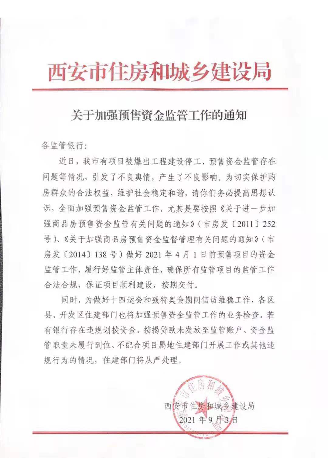 西安市住建局9月3日印发《关于加强预售资金监管工作的通知》。