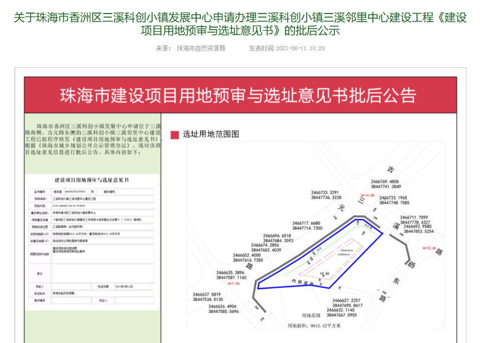 在金湾滨海商务区挂出两宗宅地后,昨天,三溪科创小镇也挂出了一宗涉宅混合用地。