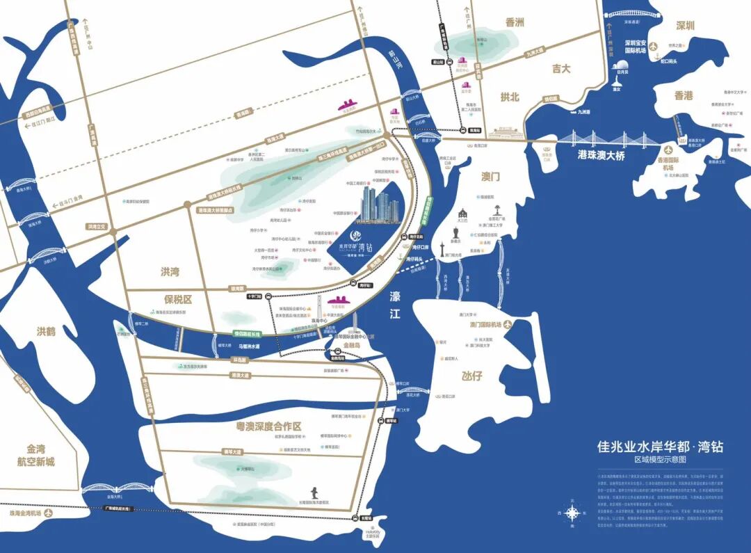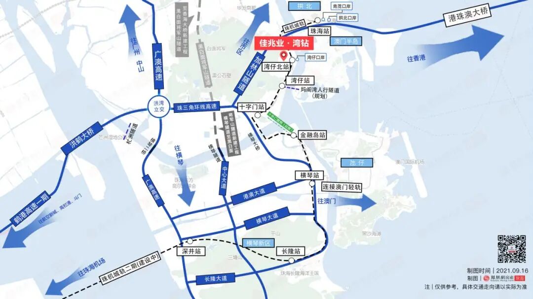 在立体交通路网上,佳兆业·湾钻为城轨湾仔北站上盖物业,向北可直接抵达拱北、广州、珠三角等地;向南直达横琴口岸,未来可衔接澳门轻轨,通过珠机城轨二期(预计2023年开通)可直达珠海机场,对话世界。