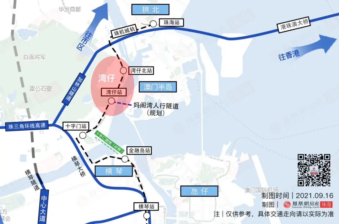 如图所见,湾仔区域的地理位置占据先天优势。一方面,它与横琴岛相邻,伴随着珠海经济特区的成长,湾仔历年来都是大陆来往横琴的必经之地。如今,已有横琴大桥、十字门隧道(预计2022年通车)、珠机城际一期相连接。
