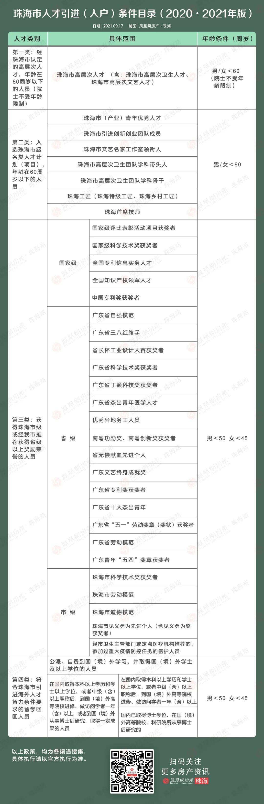根据最新的珠海放宽人才引进及入户条件的通知,珠海人才引进及入户条件进一步放宽,具体如下:人才引进的对象范围放宽为:我市用人单位引进的人才且在我市缴纳社会保险费或工资薪金个人所得税。将具有国家教育部承认的大专(高职)以上学历人员、人社部承认的技工院校高级工班及以上毕业生纳入人才引进范围。即含教育部学信网可查询的非全日制大专(高职)以上学历,人社部可查询的技工院校高级工班及以上毕业生,不再需要全日制学历。学历人才、职称人才、具有国家职业资格等级的技能人才、重点企业一线优秀员工的引进年龄统一为男性50周岁以下、女性45周岁以下。1.取消引进三级、四级国家职业资格证书技能人才须“与工作岗位匹配”的限制条件;2.取消四级国家职业资格证书须“符合《2018-2019年珠海市技能人才紧缺职业(工种)目录》”的限制条件;3.取消我市技工院校和中等职业院校毕业生须“连续缴纳社会保险费一年以上”的限制条件。此外,符合《珠海市贯彻落实“广东技工”工程实施方案》(珠府办〔2020〕7号)相关技能人才入户条件的人员,按照其规定办理。毕业五年内全日制本科以上学历人员,可凭毕业证和相关资料直接向公安派出所申请落户。即在珠海无工作、无社保、无住房,但属于毕业五年内的全日制本科以上学历人员,即可申请落户。在我市重点企业工作满2年以上(金湾区、斗门区、高栏港区为满1年以上),确属本企业发展急需的一线管理人才和技术骨干,可按程序申请办理引进及入户手续。重点企业目录由市人力资源社会保障局负责牵头各部门、各区动态编制。注:本通知自2020年12月25日起执行,有效期两年。其他规定与本通知不一致的,以本通知为准。“先落户后就业”由市公安局负责落实和解释,其他由市人力资源社会保障局牵头落实和解释。具体可拨打珠海市民热线“12345”咨询。附:《珠海市人才引进(入户)条件目录(2020-2021年版)》: