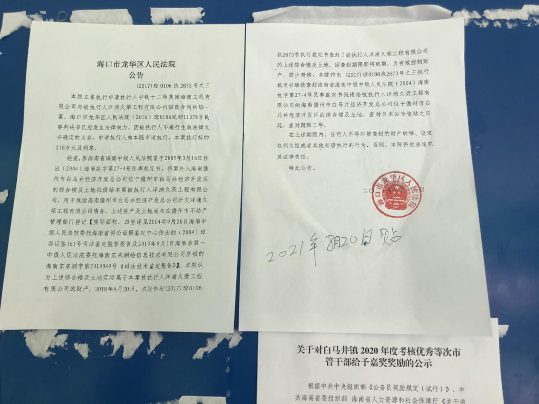 8月20日上午,海口市龙华区人民法院执行法官一行5人,专程从海口赶赴140公里外的儋州市白马井镇政府办公所在地。法院执行法官驱车近两个小时,只为张贴一则查封公告。这则查封公告最后被张贴在镇政府办公楼一楼公告栏最显眼位置。9月10日下午,中国房地产报记者在白马井镇政府采访时仍能见到这则查封公告,公告末尾空白处用水笔写上“2021年8月20日贴”字样。龙华区法院不仅在这处综合楼的公告栏张贴查封公告,8月30日出版的《海南日报》A11版也刊登了这则查封公告。这则查封公告主要内容为,龙华区法院立案执行申请执行人中铁十二局集团海南工程有限公司(以下简称“中铁十二局海南工程公司”)与被执行人久荣公司借款合同纠纷一案。公告称,因被执行人久荣公司不履行生效法律文书确定的义务,申请执行人中铁十二局海南工程公司向龙华区法院申请执行,本案执行标的210万元及利息。这次查封期限为3年,即从2021年8月20日起至2024年8月19日止。查封公告还称,在上述期限内,任何人不得对被查封的财产转移、设定权利负担或者其他有碍执行行为,否则法院将依法追究有关方法律责任。法院的这次查封是一次“续封”。记者了解到,早在2018年8月20日,龙华区法院查封了儋州市白马井经济开发总公司(以下简称“白马井开发公司”)抵债给久荣公司位于儋州市白马井经济开发区的综合楼及土地。按照上述公告记载内容,综合楼财产及土地使用权归属久荣公司,久荣公司欠下中铁十二局海南工程公司债务,没有履行相关生效法律文书确定的义务。为此,法院再次对久荣公司财产——综合楼及土地进行查封。记者经调查了解到,上述被查封的综合楼及土地,正是白马井镇政府等目前正在使用的办公场地。据白马井镇政府工作人员介绍,全镇机关各部门现有数百名工作人员在此办公。由于是“活封”,目前对镇政府等机关办公未构成实质性影响。据2004年9月的一份司法鉴定报告记载,这处综合楼一共3层,总建筑面积1641.67平方米,综合楼占地面积640.39平方米,用地面积7131.64平方米。对于公告上“不履行生效法律文书确定的义务”一说,久荣公司方面回应称,由于白马井开发公司至今欠着他们一大笔工程款,其企业也面临倒闭,无力归还这笔210万元债务。那么,白马井镇政府为何在一处被查封的办公楼里办公呢?这中间究竟发生了什么?事情还得回到29年前。1992年,海南西部的儋州正值撤县建市(1993年撤销儋县,设立县级儋州市),作为儋州中西部的滨海重镇——白马井镇,因其地处北部湾和洋浦湾交会处南岸的重要区域位置,原儋县政府要将其规划打造成新区,提振经济发展。1992年7月,原铁道部第十二工程局振海公司洋浦开发公司(以下简称“振海洋浦公司”)与白马井开发公司前身儋县土地开发服务公司签订了《儋县白马井镇规划新区土地基础设施工程建设托包合同》,振海洋浦公司作为工程项目承包方,负责该规划新区土地“六通一平”基础设施工程建设。“久荣公司是作为振海洋浦公司联营合作单位,负责白马井镇规划新区土地基础设施建设工程实施。”久荣公司管理高层王滨告诉中国房地产报记者,虽是“联营合作”,实际工程施工是久荣公司负责具体实施,工程签约承包方振海洋浦公司从中收取一定管理费用。记者在相关法律文书中见到,按照上述合同约定,工程承包方对白马井镇规划新区的1537.34亩荒地进行“六通一平”基础设施建设,工程总造价概算约2.1亿元。“作为基础设施工程施工方,久荣公司为白马井镇规划新区日后开发建设奠定了基础。”王滨称,位于该区域儋州滨海新区的房地产项目一个接一个,昔日冷清的滨海小镇由于久荣公司的前期开发,如今一派热闹非凡景象。据王滨介绍,为了该基础设施工程施工,久荣公司当时斥资近5000万元,购买了近3000万元大型施工机械、车辆及其他工程设备,前期垫资近2000万元。由于政策等多方面原因,工程施工进行到1994年3月被叫停。之后因工程结算问题,白马井开发公司与工程承包方振海洋浦公司等方面发生意见分歧。后经儋州市政府协调,振海洋浦公司与白马井开发公司同意由儋州市建设局于1996年6月14日审定的工程结算书,工程造价约3546万元,已付工程款约1786万元,尚欠1750万元。久荣公司在讨要这笔工程款时却遇到了麻烦。据此前多份法律文书记载,因白马井开发公司在儋州市投资促进会有存款9500万元,该公司若提取支付施工单位工程款,需要儋州市主要领导审批后才能拨款。1996年9月及2001年12月,白马井开发公司先后两次向儋州市政府进行报告请示,均未得到回应。“后来,儋州市投资促进会又被儋州市政府撤销了,那笔代管的9500万元存款也进入了儋州市财政。”王滨称,久荣公司被拖欠的工程款因此一直没有得到落实。由于迟迟要不到工程款,2002年久荣公司将白马井开发公司诉至法院,追要尚欠工程款和相关利息。经一审、二审两级法院几次审理,海南省高院于2011年作出终审判决,白马井开发公司应向久荣公司支付欠款共计2382.6839万元(含利息)。值得注意的是,据法院查明,白马井规划新区自1992年成立以来,共收到地价款1.019亿元,预收土地定金2.863亿元。也就是说,当时白马井规划新区一级开发土地上,产生的直接经济收益多达3.887亿元。其中,由儋州市国土局直接收款上缴儋州市财政9300万元,由开发区