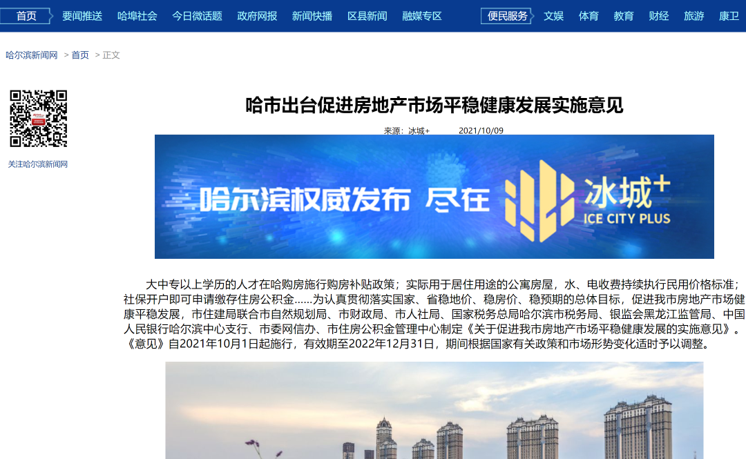 据哈尔滨新闻网,为认真贯彻落实稳地价、稳房价、稳预期总体目标,促进哈尔滨市房地产市场健康平稳发展,哈尔滨市住建局联合市自然规划局、市财政局、市人社局、国家税务总局哈尔滨市税务局、银监会黑龙江监管局、中国人民银行哈尔滨中心支行、市委网信办、市住房公积金管理中心制定《关于促进哈尔滨市房地产市场平稳健康发展的实施意见》(以下简称“意见”)。意见自2021年10月1日起施行,有效期至2022年12月31日,期间根据国家有关政策和市场形势变化适时予以调整。