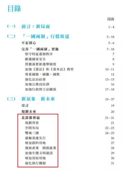 施政报告目录页丨被放于重要位置重点论述的北部都会区“北部都会区发展策略”的核心是构建一个占地300平方公里的都会区,该面积占到香港陆地总面积近三成,未来将容纳约250万人口,也是中国香港特区公布的规模最大的一份规划蓝图。据林郑月娥强调,北部策略虽则是香港本地规划蓝图,但却是建基于“十四五”规划、大湾区建设及前海扩区。根据规划,北部都会区将通过7个跨境口岸和未来兴建港深西部铁路等,使港深两地能跨越“两湾一河”,形成“双城三圈”的空间格局,帮助香港更好融入国家发展大局。在“双城三圈”空间概念下,深港间的经济、基建、创科、民生和生态环境都将越发紧密,一个以深港为核心的湾区超级都市圈跃然纸上。