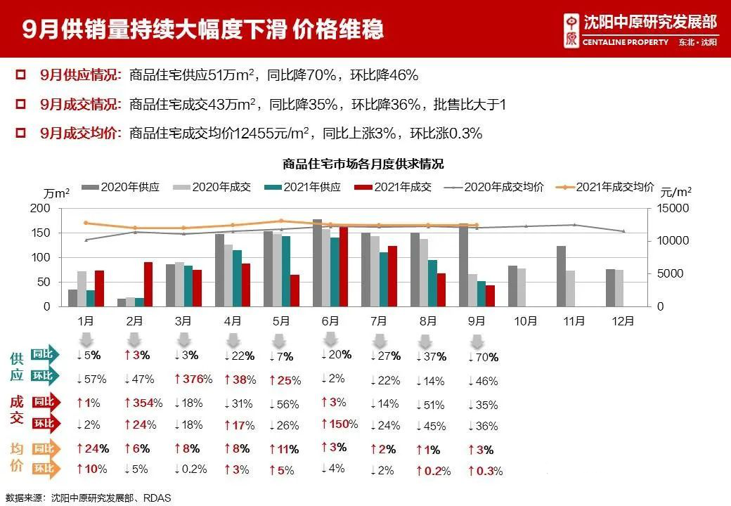 价格方面,数据上表现还比较坚挺。根据统计,9月沈阳住宅均价为12455元/平方米,同比仍上涨0.3%。