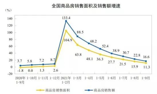 国家统计局18日公布最新统计数据,2021年1-9月,全国商品房面积13.03亿平方米,增速较1-8月份下降4.6个百分点;商品房销售额134,795亿元,增速较1-8月份下降6.2个百分点。