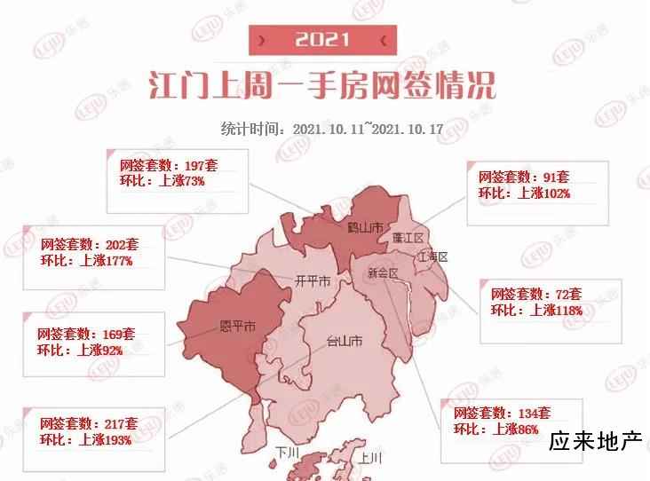 各区域一手住宅网签情况:蓬江区网签91套,江海区网签72套,恩平市网签169套,新会区网签134套,鹤山市网签197套,台山市网签217套,开平市网签202套。