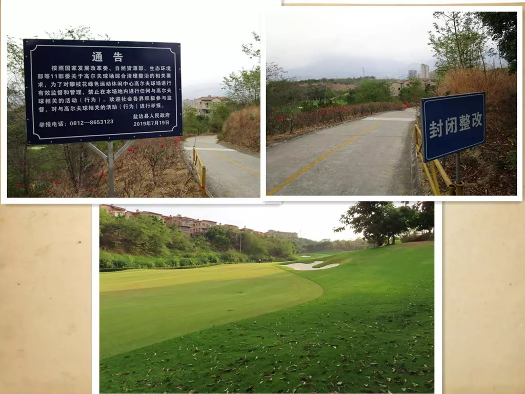盐边县政府对该球场从未停止整顿工作,去年5月现场调查发现,该球场入口设置铁栏围挡,竖立公示牌,紧邻公路的练习球场上种植数百棵小树苗,发球台及其附属建筑设施贴有查没封条。盐边县政府2019年7月的治理“通告”牌上文字显示,“按照国家发展改革委、自然资源部、生态环境部等11个部委关于高尔夫球场综合清理整治的相关要求。为了对攀枝花绿色运动休闲中心高尔夫球场进行有效监督和管理,禁止在本场内进行任何与高尔夫球相关的活动(行为),欢迎社会各界积极参与监督。”另一个2018年11月5日的会所设施封条上写,“罚没资产,延边县国土资源局、盐边县财政局。”