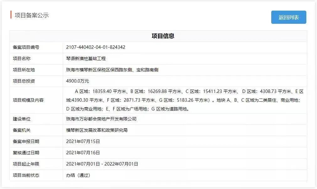 早在7月,万科琴澳传奇已经进行了备案,备案名为琴语新澳。