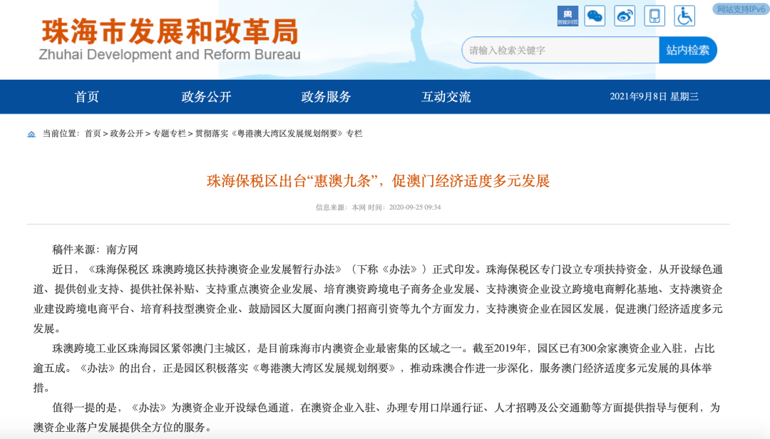 据官方数据显示,目前横琴拥有澳资企业已超4300家,注册资本规模超过1300亿元,成为内地澳门企业集中度最高的区域。横琴新区管委会在2020年提出,力争到2025年,横琴人口规模超过20万,在横琴居住、就业的澳门居民增至3-5万人;在横琴经营的澳资企业增至1.5万家左右,将是目前的3倍之多另一方面,合作区新政出台,对于澳企、澳门人才采取更包容的态度,鼓励优惠政策更是空前。大量粤澳产业、高质人才势必闻风而来,呈数量级增长。在此背景下,横琴产业向外“扩容”将成趋势,保十琴一体化区域被“委以重任”。从以下两点,足以说明。其一,与横琴“一桥之隔”的保税区,承接多个横琴政府机构,行政基因已显现。据悉,珠海横琴新区应急管理局(综合执法局)、横琴珠港澳(涉外)公共法律服务中心、珠海横琴新区规划和自然资源局(海洋局)等政府机构,近期纷纷搬迁至保税区。事实上,城市遵循“区府经济”的底层逻辑。行政机构的落位,也侧面反映了城市发展的导向。如珠海的新香洲、航空新城,落位多个行政机构,优质资源强势聚拢,带动板块向上发展,成为“高配地段”。这无疑释放新的信号,保十琴一体化区域,或将成为下一个“政务中心”。化身一个超级流量入口,吸纳无数优质产业靠拢。其二,保税区定向对澳企抛出“橄榄枝”,出台多项利好优惠政策,将成为衔接“琴澳”的核心拓展区。作为珠江西岸唯一的保税区,实际早已出台一系列针对澳资企业的优惠政策,担负承接澳门“中小企业”的使命。与横琴相似,保税区向澳企开设了绿色通道,并设置专项资金补贴与奖励如在跨境电商领域,政策便支持澳企设立跨境电商孵化基地,给予定额50元人民币/平方米/月的运营补贴,年度补贴上限达100万元人民币。不难理解,在珠海十四五规划中,同样点明了保十琴一体化区域的方向,定位为珠海的城市新中心。因此,保十琴一体化区域,不仅是“琴澳”产业外拓的重要一环,更被赋予高站位,成为珠海经济产业的“发力点”所在。